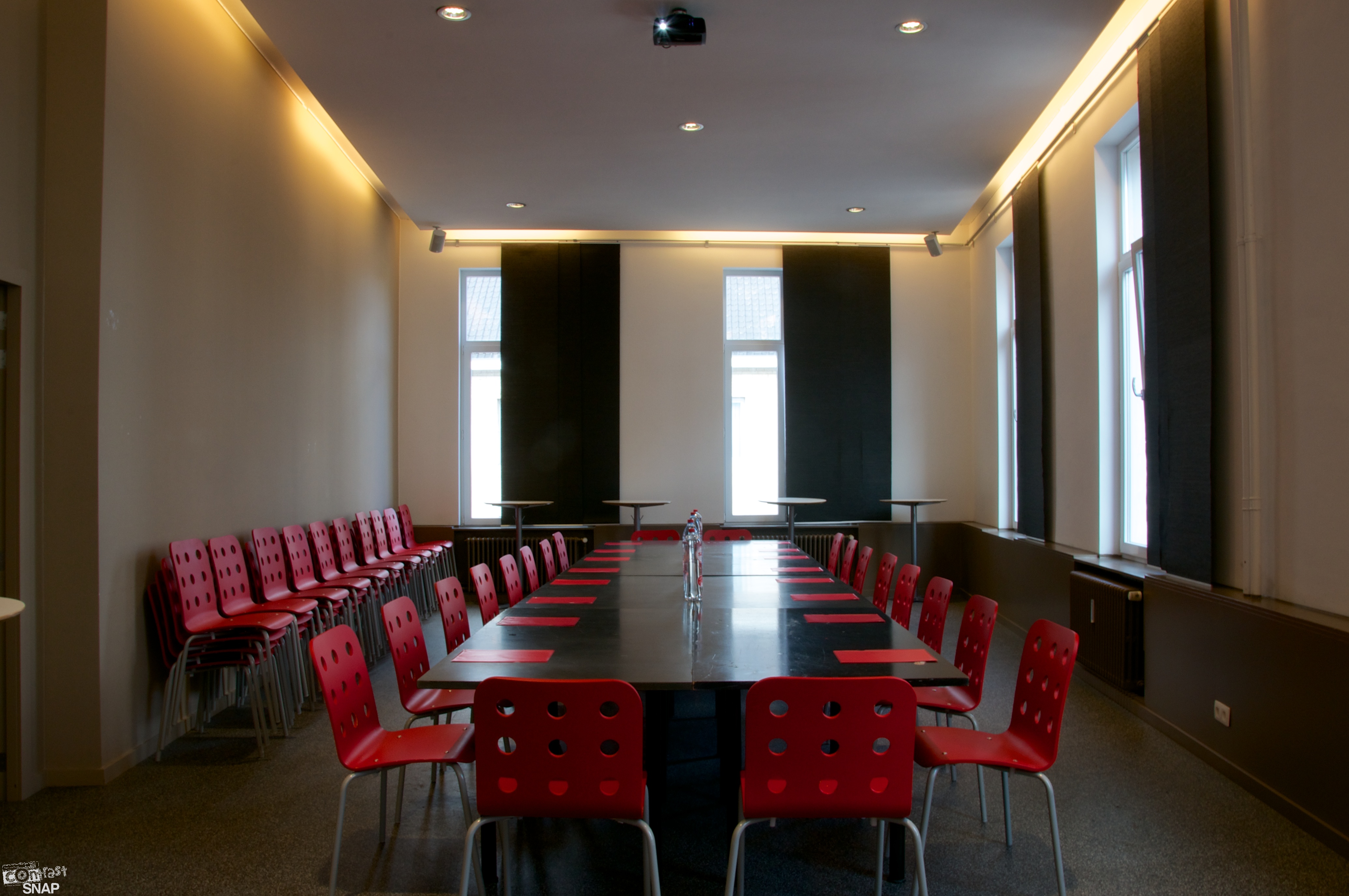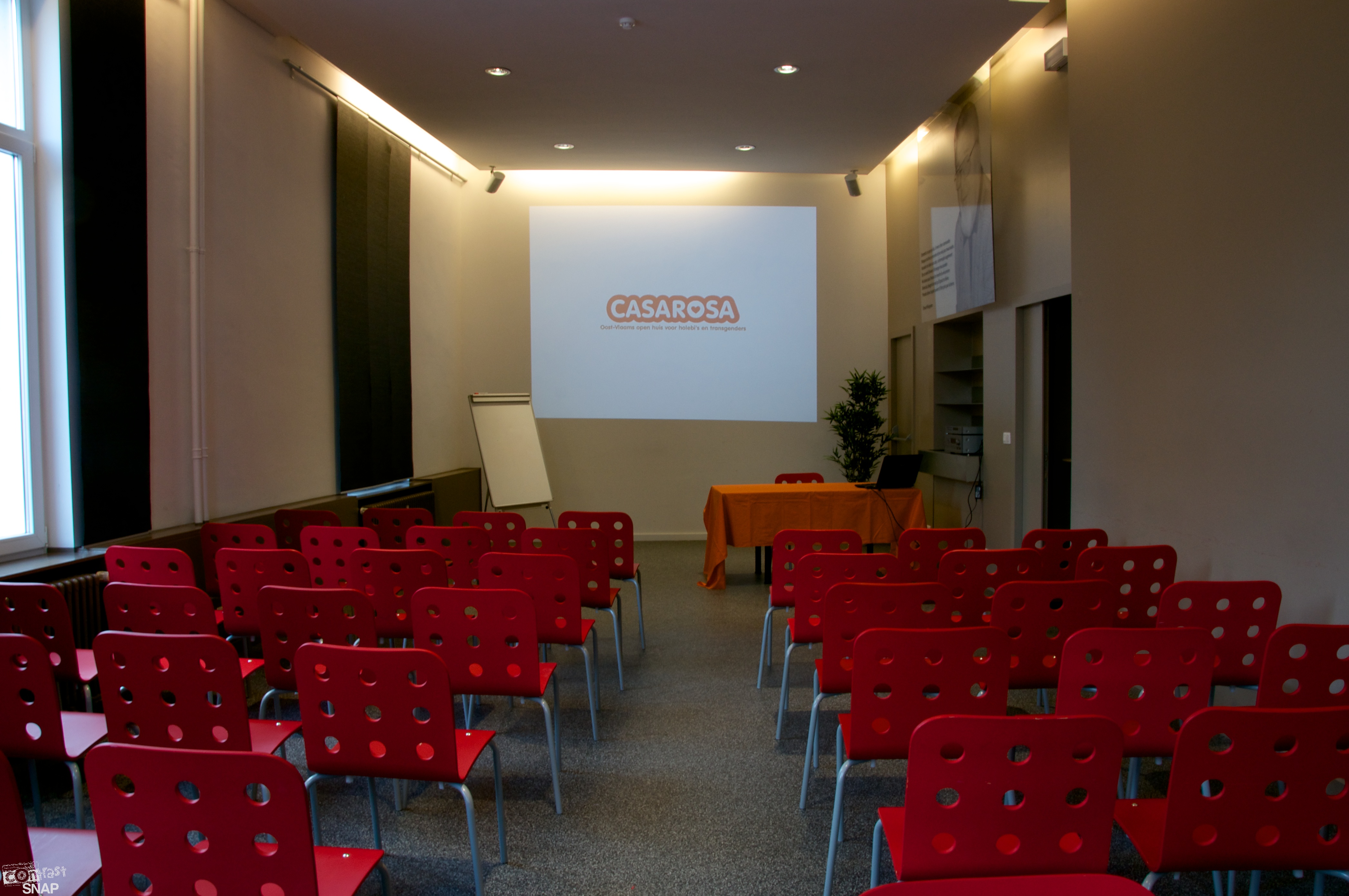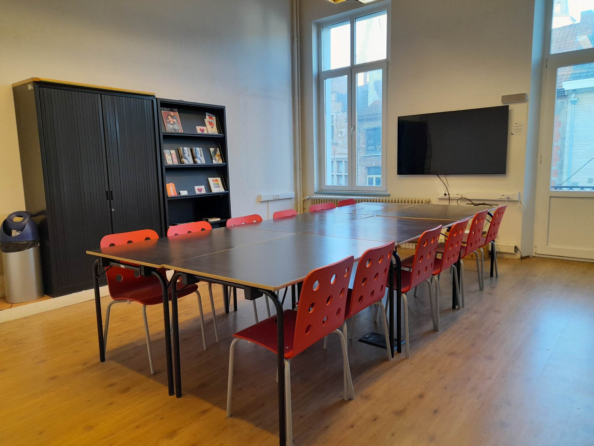 Deze ruimte op de eerste verdieping van het gebouw biedt u de perfecte ruimte voor vergaderingen, presentaties en vormingen. Beamer en geluidsinstallatie zijn standaard aanwezig. De zaal kan in verschillende opstellingen geplaatst worden. Deze ruimte heeft een capaciteit van 65 personen en is vlot toegankelijk voor rolstoelgebruikers.